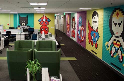 I would like to take this moment to formally apologize in advance to everyone in the Bustle office, because now that I have seen the results of these office workers who covered the walls in superhero murals made of Post-It notes I literally have no choice but to do it myself. I am compelled to start sticking things to the wall the way babies are compelled to take their first breaths. It is natural. It is right. It is all our beloved comic book characters from DC and Marvel, staring at you while you work in all of their spandex-clad, two-dimensional glory.