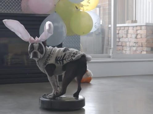 Any time you put a small creature on a Roomba, funny things happen. And I really mean it — any creature can be placed on a Roomba with hilarious results. Cats, dogs, lizards, baby humans...it really doesn't matter. We'll all watch and we'll all enjoy. And it's hilarious because their reaction is always kind of the same: disinterest, mild annoyance, and embarrassment, which is kind of weird. I feel like if I were small enough to ride on a Roomba I would be really super into it! And if you put me in a costume? EVEN MORE into it! Who doesn't love dressing up? Apparently Five, the Boston terrier in this video. Though maybe that's because the little guy is clearly in a Christmas sweater and it's Easter? Call me a traditionalist or a nit-picker, but I've always believed in the sanctity of seasonally appropriate holiday wear for pets.