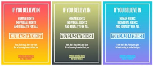 If you believe in "human rights, individual rights and equality for all," you're probably a feminist. So reads the winning design in the "Feminism is for Everyone" poster contest sponsored by women's website VITAMIN W, The 3 Percent Conference and Miss Representation. "If not that's okay ... we're moving forward without you," reads the blue ribbon winner, designed by Mariam Guessous.