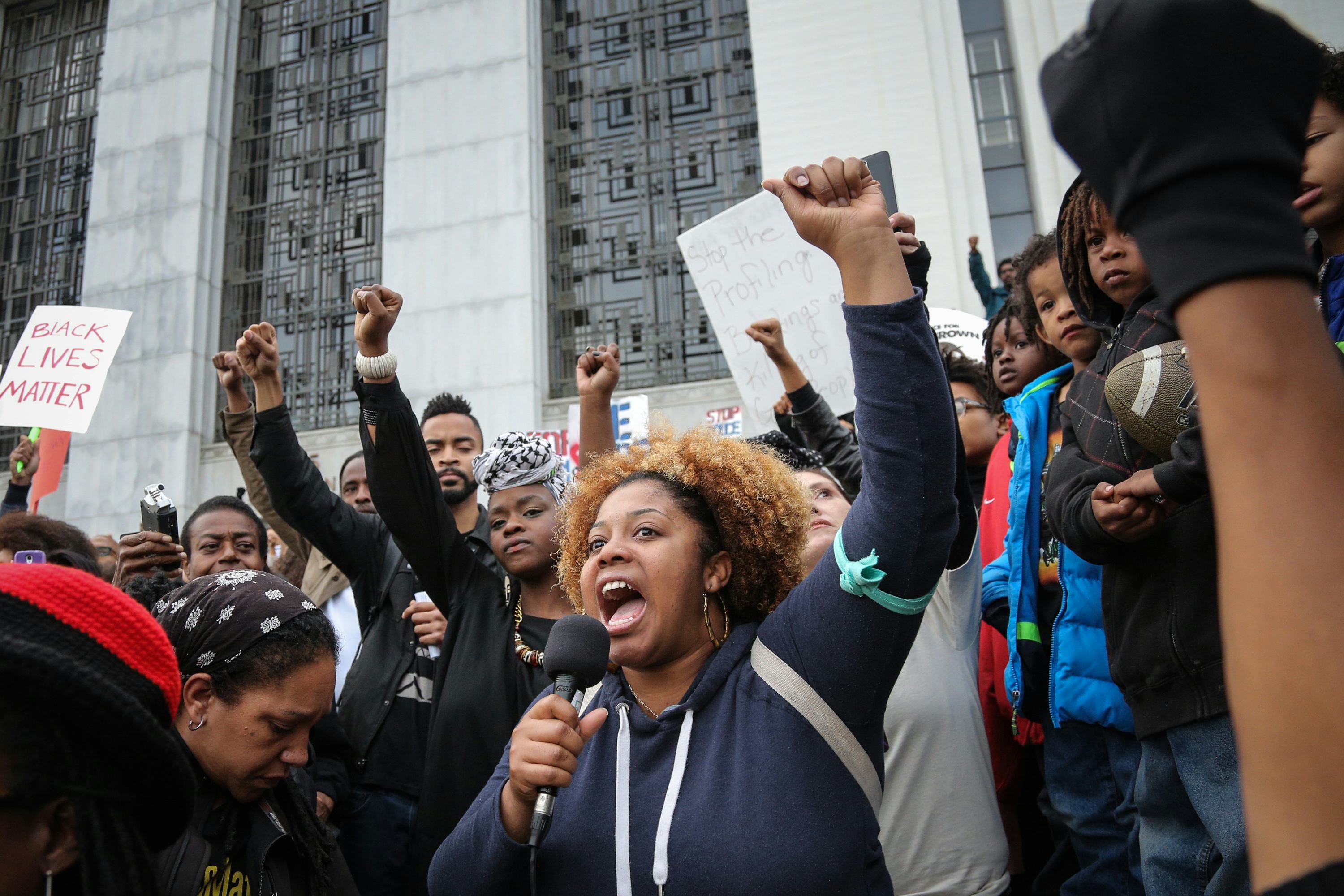 A march across New York's Brooklyn Bridge took place Tuesday as demonstrators held signs that read "Stop murder by police." In Los Angeles, protesters blocked part of a metro rail line during rush hour traffic. Three protesters were arrested in Birmingham, Alabama. In Springfield, Massachusetts, 16 participants were arrested on charges of being disorderly. Protests also took place in San Francisco, Seattle, Cleveland, and Oakland, California.
