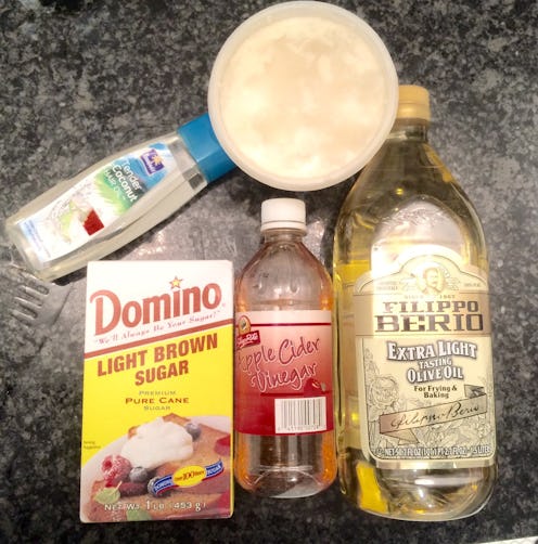 What you’ll need: A warm bath, a washcloth, bath mitts or bath gloves, sugar or salt, olive oil, apple cider vinegar, and coconut oil.