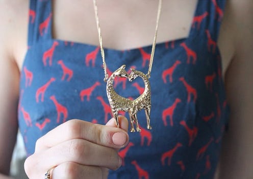 I'm in love with everything about this necklace and dress combo. From the novelty print featured on the dress to the precious implied heart in the negative space of the necklace, this look is a winning way to celebrate your admiration for giraffes.