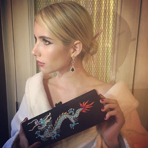 As fashion's elite primp and preen in anticipation of the 2015 Met Gala, Emma Roberts has posted the first Met Ball selfie of the evening, and it is a humdinger. Clad in what appears to be an incredibly plush terrycloth bathrobe, the American Horror Story actress displayed a dramatic winged cat eye, contoured cheeks, crimson tips, and... hair sticks. Oh no. Much has been made of the gala's "China: Through the Looking Glass" theme, which provides ample opportunity for sartorial experimentation and the potential for cultural appropriation. Roberts' delicate Art Deco drop earrings are befitting for a red carpet event, but the actress's hair sticks and dragon-adorned clutch are quite another matter.