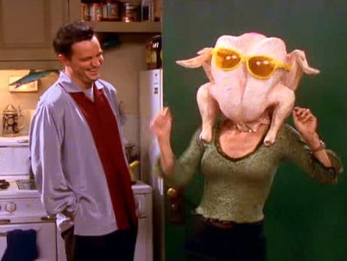 Wait, maybe THIS is the best-known Friends food moment. Monica dancing for Chandler with a turkey on her head is a classic, especially since it leads to Chandler saying "I love you" (and then quickly taking it back) for the first time.