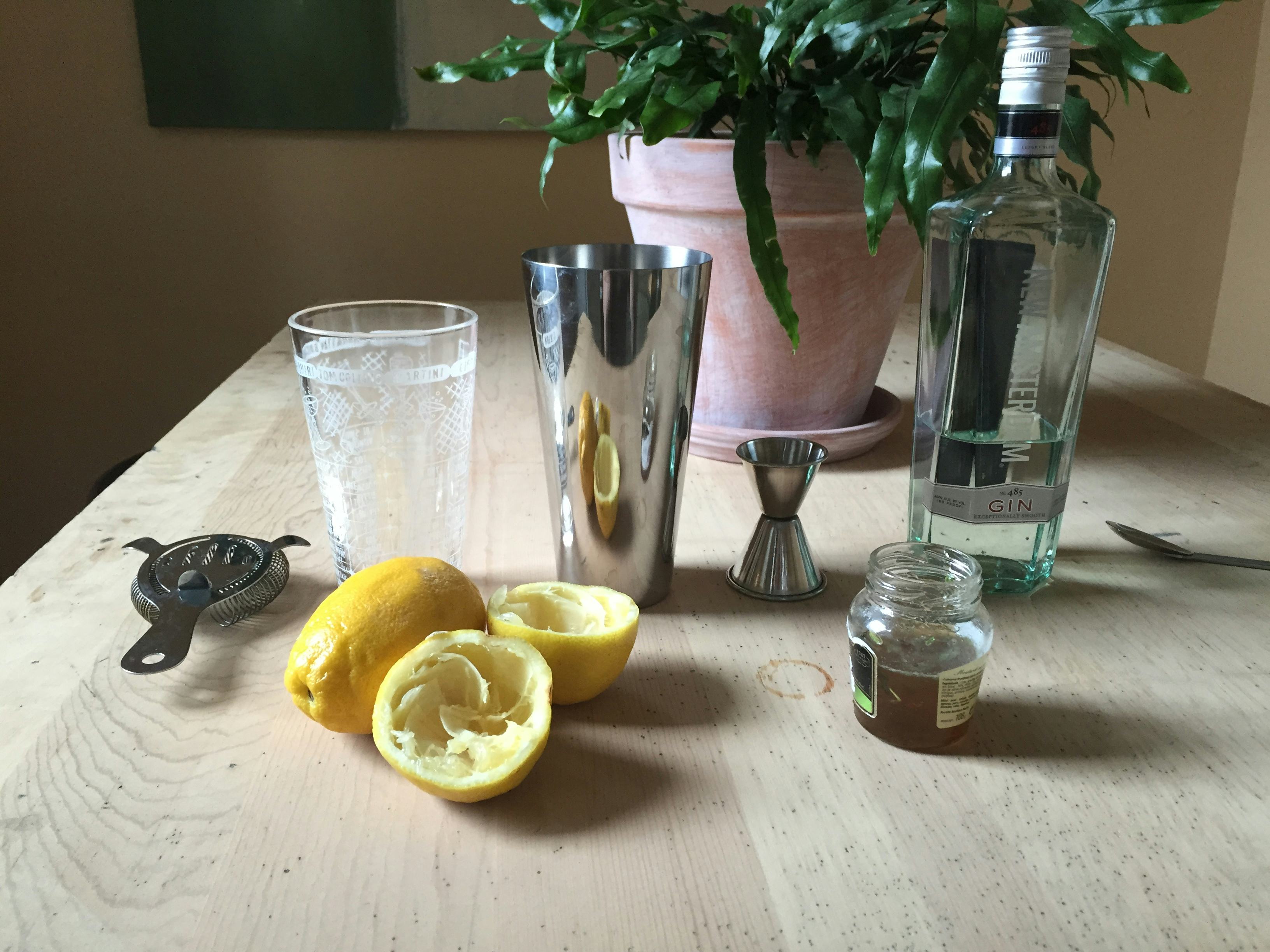 For our “beginners” drink, I made a twist on a Bee’s Knees, which is a Prohibition-era cocktail. At the time, the lemon and honey were intended to cover up the not-so-great taste of bathtub gin. Now, though, they’re just there to be delicious. I added thyme to the equation, and the result is sweet, tart, and gently herbal: perfect for introducing you to the wide world of gin.