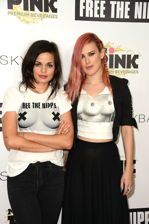 In order to look into this censorship that extends both online and off, Plank met with #FreetheNipple activist Lina Esco, who is leading the charge on a movement that is seeking to desexualize and decriminalize women's nipples. "The nipple has been hidden for so long in American media," Esco said, which prompted her to start making her documentary film, Free the Nipple. "I wanted women to go topless in New York City (where it's legal to do so, by the way) to challenge the censorship laws for equality." She realized that getting women to go topless was an even more challenging task than she anticipated, which is what sparked the social movement and media campaign that has come before the film's release. #FreetheNipple has since gone viral, with celebrities like Rumer Willis and Miley Cyrus speaking out with the hashtag on their social media profiles. (That's Esco with Willis up top.)