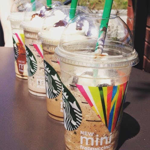 You know that Starbucks Mini Frappuccinos are here. You know that they're 10 ounces, so they're smaller than a normal Frap, and that they cost an average of 20 to 30 cents less than a Tall. But do you know what flavors you can get a Mini Frappuccino in? Don't worry — I investigated so you don't have to.