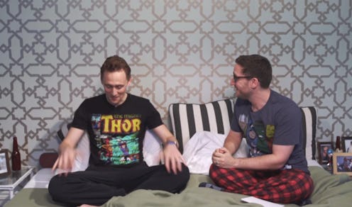Gangly Shakespearean Brit and generally pleasant human Tom Hiddleston is on a press tour for Thor: The Dark World right now, which means that we see new things that he's said and/or done every day, which subsequently means that we spend much of our day sobbing into our pillows because he's so damn cute. Hiddleston (or Hiddles, as he known on tumblr and in our hearts) sat down with MTV's Josh Horowitz this week for a sort of pseudo-sleepover that we're not entirely convinced wasn't created entirely from our fantasies. In it, Hiddles plays F***/Marry/Kill and Truth or Dare, dances (snake hips!!!), and reveals that he, Tom Hiddleston, saw Thor co-star Chris Hemsworth naked.