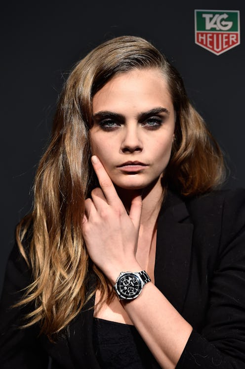 Delevingne rounded off her outfit with some edgy lace-up, open toed booties, metallic blue nail polish, and some layered necklaces, for that Cara rock and roll edge. She also wore her very own TAG Heuer-Carrera Cara Delevingne Edition watch. No big deal.
