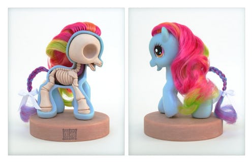 Most children, at some point or another, will take apart one of their dolls out of curiosity to see what their beloved Barbie looks like on the inside. If they happen to choose one of Jason Freeny's skeleton sculptures to play doctor with, though, they're in for a nasty surprise. Like many artists, Freeny hits you right in the childhood in his work, although his approach is certainly unique. The former industrial designer-turned-sculptor has gained popularity by cutting popular children's toys in half and filling them with realistic innards, including a skeleton and, of course, disturbingly realistic organs. According to Bored Panda, Freeny found his calling after losing his job during the financial crisis. He found himself broke after six months of unemployment and turned to selling his sculptures on eBay, where they sold for increasingly large sums of money. By now, some of his work reportedly fetches up to $17,000, which means that someone, somewhere, chose to spend the cost of a new sedan on a My Little Pony. I'm just going to let that sink in for a second. All jokes aside, the sculptures are significantly cooler than they sound on paper. There's something compelling about literally peeling back the layers of your favorite toys, and I'm sure many an essay could be written about seeing Barbie's poor organs crammed into her tiny abdominal cavity. Plus... well, they're just neat-looking. (If you listen closely, you can hear the sounds of art critics around the world cringing.)