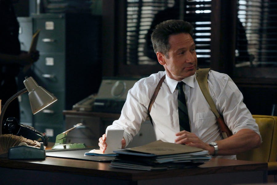 David Duchovny makes his glorious return to network TV tonight, and he did not disappoint. We started off strong with Sam Hodiak (Duchovny) shirtless and working out (thank you, NBC). After that it was nothing but dapper suit after snappy outfit. Retro-amazing clothes aside, the Aquarius series premiere jumped right into the action, zeroing in on Sam’s investigation into the disappearance of Emma, a young girl who just so happens to be well-connected, and the daughter of an ex-girlfriend. We learn a lot about Sam over the first two hours of the show, but the main takeaway is this: He's a really good cop, and has no boundaries or scruples when it comes to closing a case. I think this will lead to trouble, now the the Black Panthers have arrived and have it in for Sam on Aquarius.