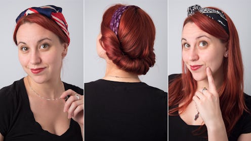 Again, section your hair into faux bangs, or leave your real bangs forward, and put the remainder of your hair into a low ponytail. Fold your bandanna or scarf in half, then half it again, and wrap it around your neck. Then, simply pull the ends up toward your brow and tie a secure knot. Double or triple knot the scarf (depending on how long the tails are), and tuck any remaining fabric under the band you've created. Finally, remove your hair tie and arrange your hair around the band. Voila! Sassy!