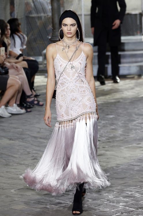 According to The Cut, Riccardo Tisci handpicked some of his favorite female models to walk in his show. And the designer certainly didn't skimp on talent. Including Jenner, he had a handful of female models grace the runway in heavily accessorized, sheer dresses that fit in perfectly with his menswear designs. Dressed in both hard and soft color palette, the women were all outfitted in black headbands and hoop earrings as well. Their heavily winged eyeliner brought a feminine touch to these fierce looks, but they managed to fit right in with the men, who wore skirts and sequined pinstripes.