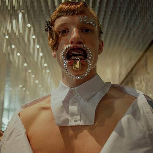 “We did pacifiers, and we just sort of wanted to consider this idea of how when you’re being vocal, you’re being very open,” Oliver said. “This is a voice, physically you can see it, but this person is trying to say something to you even though they are silent.” Hood By Air's "Babycore" inspired collection featured bejeweled mouthpieces, including pacifiers, grills, and braces, as well as exaggerated cheek separators, fangs, and padlocked mouthpieces. The models' hair were styled into androgynous bangs and fringes, punched up with barrettes and rhinestone-studded letters spelling out fetishistic words on their foreheads. The clothes consisted of deconstructed shirts and jackets, pleated shorts, and oversized leather trousers.
