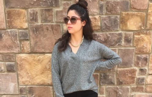 The long sleeves on this blouse balance out the thin and narrow fit of the leggings. While it’s definitely a more casual combination, it can be dressed up with heels and cute personalized jewelry. The baggy fit of the blouse allows for a good amount of airiness so you don’t feel suffocated by the collar or long sleeves. Since you’re wearing leggings, you'll basically be the most comfortable human being on Earth.