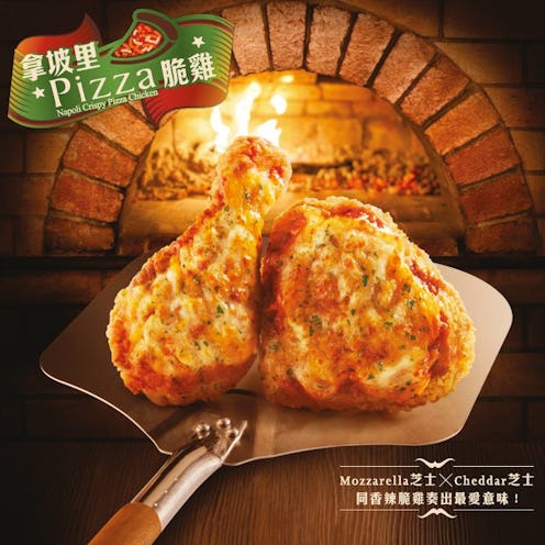 According to Metro, Napoli Crispy Pizza Chicken consists of Original Recipe fried chicken thighs and drum sticks, plus a tomato sauce base and some sort of “breaded mozzarella and cheddar mix.” Although at first I experienced a certain amount of confusion regarding what, exactly, that “breaded mozzarella and cheddar mix” entailed, a video posted on the KFC Hong Kong Facebook page cleared it up somewhat: It looks like the chicken is breaded before getting a delicate sprinkling of cheese. The cheese subsequently melts on top of the breading, leaving you with something sort of like an inside-out mozzarella stick. With chicken. Or… something.