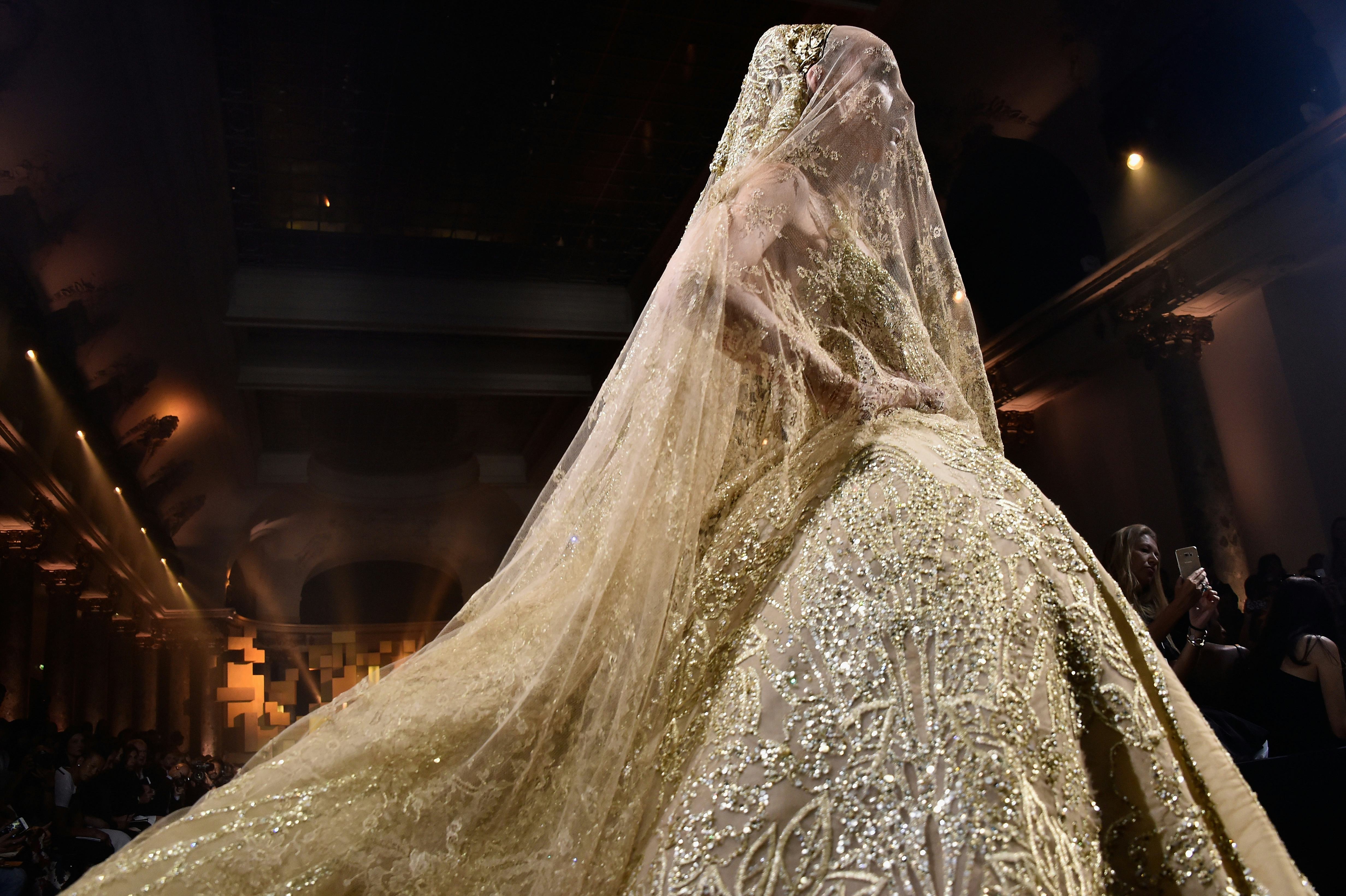 Fittingly, the show was themed around angsty princesses (let's make an official petition for this to be the theme of all future fashion shows) — the models wore intricate tiaras as they floated down the runway to Nirvana and the Virgin Suicides soundtrack. The collection was made up almost entirely of shimmery gowns, and shades of gold dominated the runway, in a sweet nod to Mr. Saab's 25th wedding anniversary (On July 4th, 1990, his wife walked down the aisle in an enormous golden ball gown of his creation).