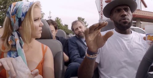 We still have a few days to wait before Amy Schumer's rom-com, Trainwreck, is released in theaters on July 17, but the internet has bestowed us with some beautiful comedy featuring the cast and director, Judd Apatow, to hold us over until Friday. On Monday, July 13, Funny or Die released a video titled, "Tranwreck: The Sequel Starring Amy Schumer And LeBron James, But Not Bill Hader." The video starts one hour before a premier where James is driving Schumer, Apatow, and Hader around his hometown of Akron, Ohio. We quickly learn that there is a hidden agenda to James' friendly tour, as he makes a stop at a fast food restaurant and begins pitching his idea for the Trainwreck sequel. His pitch begins with an idea that Hader's character, Aaron, should die basically less than a second into the movie after contracting some obscure illness. From there, the sequel would open with a scene at Aaron's funeral, where James would be "like, the shoulder [Amy] cries on." Noticeably concerned about his character's demise, Hader asks, "Can I be a ghost?" As far as James is concerned, NO, he can not. "Your first part happens and then it's, like, over for you."