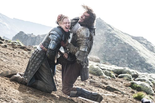 OK, this one's a bit of a stretch, but let's take a look at it anyway: In a nutshell, A Forum of Ice and Fire poster "God_made_me_do_it" posits that there's going to be an epic battle in Saltpans, between Harrenhall and the Bloody Gate. They theorize that Cersei will find Sansa, and ambush her with the help of Ser Robert Strong and the Kingsguard — but, luckily, Sansa will have the Brotherhood Without Banners (and with them, Brienne and Jamie) to protect her. Oh, and guess who else will come out of hiding to save his little bird? Yeah, that's right, the Hound. They then go on to conjecture that Ser Robert will kill Brienne, and Jaime will be so enraged, that he'll strangle Cersei with his golden hand (which, they also point out, is a fitting parallel to Tyrion strangling Shae with the Hand of the King's necklace), thus fulfilling the valonqar prophecy that's haunted Cersei for years.