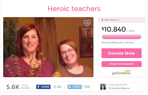 Cammie Maturin, a resident of New Iberia, La., who identifies herself as a former colleague of the two teachers, set up the fundraising page on behalf of the Iberia Association of Educators to help Meaux and Martin cover any possible medical expenses that aren't covered by insurance as well as make up for any time they might lose with the school year approaching. On the GoFundMe page, Maturin describes Meaux and Martin, who teach at Jeanerette Senior High School, as "strong," "beautiful," and "brave" heroes who have earned the love and support of their community.
