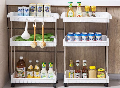 A slim cart with a 7-inch wingspan turns commonly wasted slivers of space into storage opportunities. You can even separate the top two shelves and transform them into countertop storage, then use the bottom shelf as a standalone gliding tray. This one is made of high-density plastic with stainless steel rods for longevity and you assemble it by simply snapping the components together.