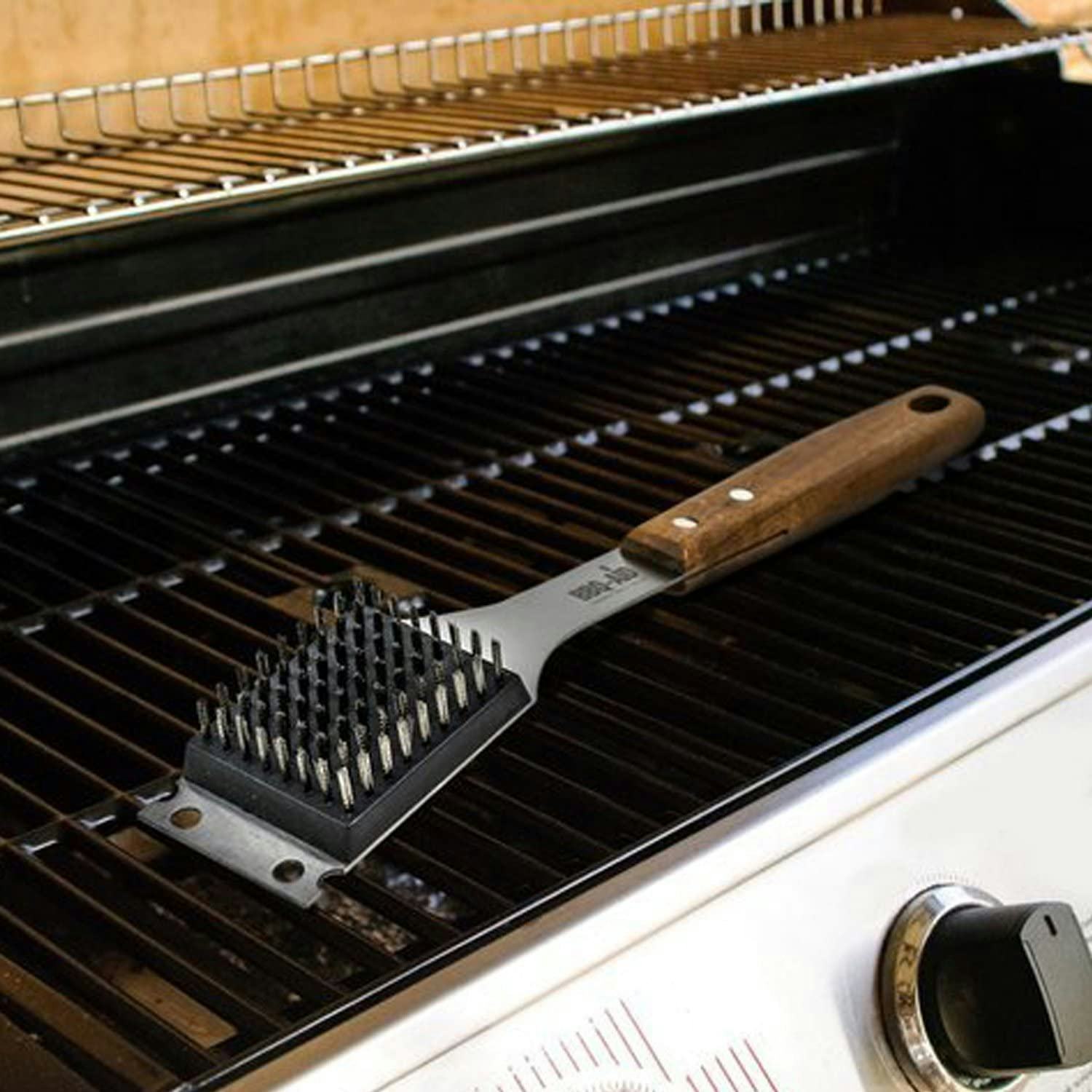 To clean off tough, stuck-on debris, you’ll need a brush with a stainless steel scraper. Stainless steel is not only a durable, heat-resistant material, but it’s also rust-resistant, so you can use it with water. Scrapers with contoured edges are best, as they can help you clean between the grates in hard-to-reach spots.
