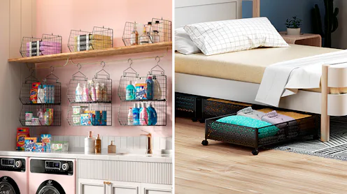 If the cabinet underneath your kitchen or bathroom sink feels like a scary black hole, you can make it functional and cute with these two-tier metal storage racks. They have wide-bottom drawers that can be pulled out to access everything in the back, while the top shelves are narrow so they easily fit around any pipes.