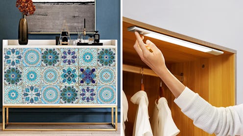 Delmonico also has a few words to say on the topic of kitchens and bathrooms, which go hand in hand because of their similar features. She tells Bustle, “Upgrade your kitchen or bathroom with peel-and-stick tile for the backsplash. Choose a tile that looks like an expensive material, such as granite or marble. Stick with a timeless shape, such as subway tile, square, or penny tile.”