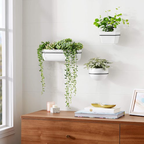 Hanging plants on your walls is a fun way to create an accent wall on a budget. This indoor wall planter is perfect for air plants or succulents. It is made of ceramic and comes with durable steel brackets to attach to the wall. It doesn't have drainage holes, but reviewers suggest adding pebbles to the bottom of the planter to promote better drainage. You can also purchase this planter in a two- or three-pack and it comes in white or grey with copper, black, or brass accents. Reviewers confirm that it's easy to install.