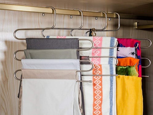 Crafted from rust-resistant stainless steel that won't bend out of shape, these hangers undulate into repeated S-shapes to provide space for five pairs of pants or multiple pairs of leggings, scarves, or other items. Using this space-saving hanger is a good way to ensure that your clothing remains hanging neatly for decreased maintenance, while the bar leaves your items virtually creaseless.