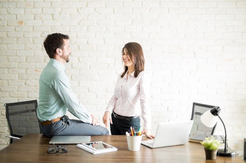Though workplace romances are sometimes frowned upon, there are ways to make it work if you find yourself in this situation. “It is very common to meet significant others at work," sex coach and author of The New Rules of Sex, Lauren Brim, tells Bustle. "I have many clients who are in happy relationships with people they've met at their office."