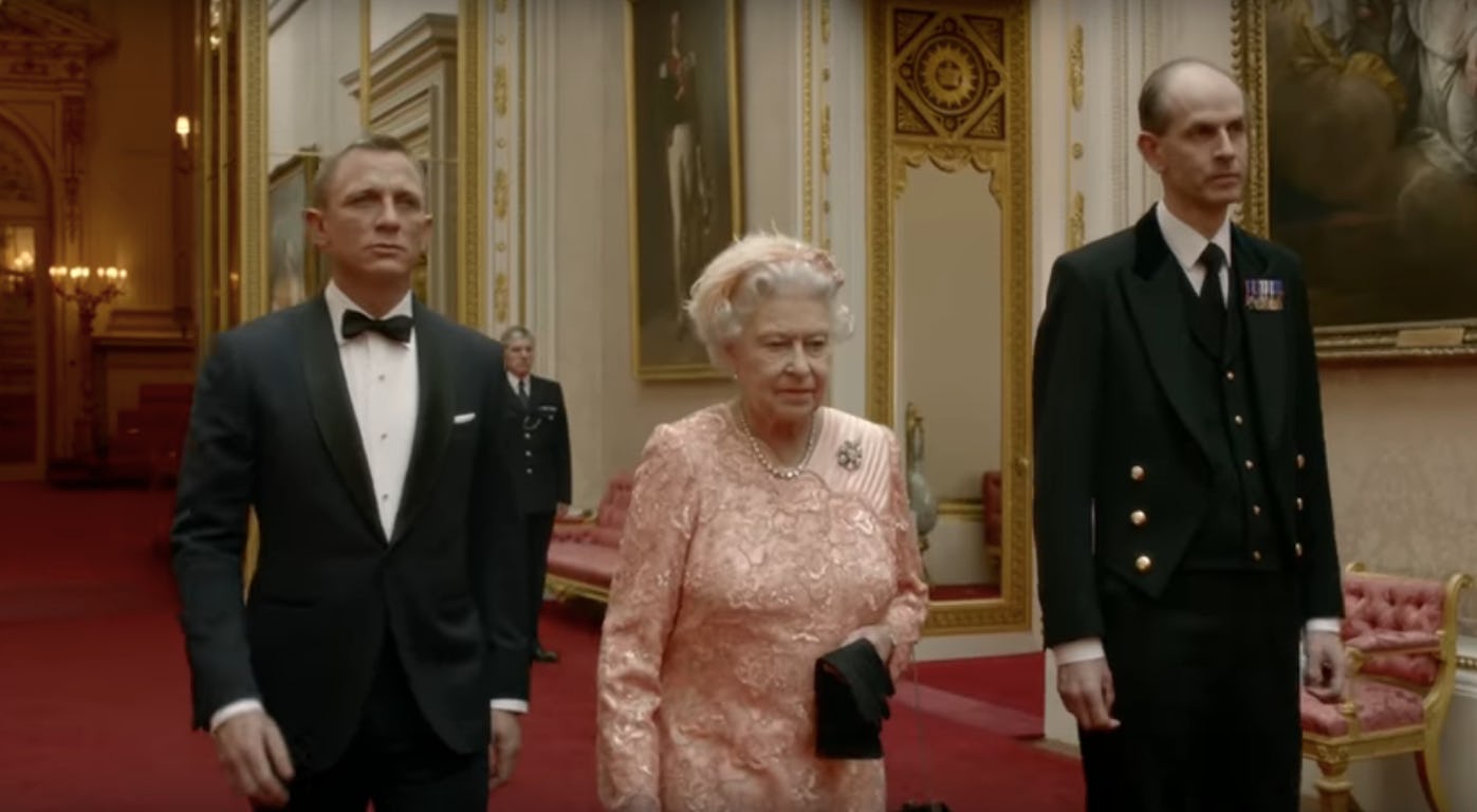 As part of the opening ceremony for the 2012 London Olympics, Queen Elizabeth was in a short movie with Daniel Craig in character as James Bond (which can be viewed here), that showed him picking her up to escort her to the games. And they arrived in style: parachuting out of a helicopter!
