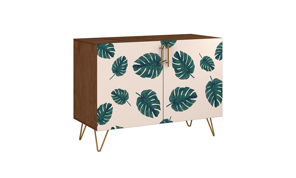 How to style: to incorporate a bold pattern into an otherwise tame room, pick a color from the pattern and implement it somewhere else in the room. For example, if you were to choose this green botanical design for your credenza, you could match a pillow cover, a curtain, a rug, or even a large candle to the exact palm leaf color.