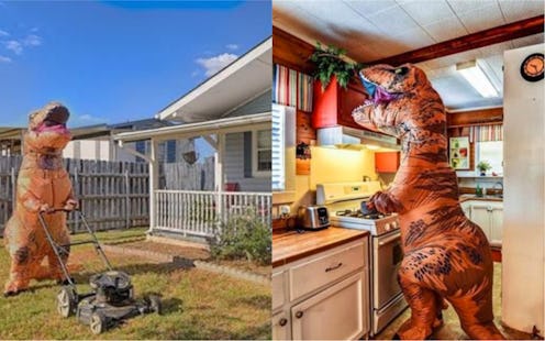 Perusing home listings online can definitely inspire and motivate us to keep saving for that down payment, and house browsing is also super exciting when we’re actually ready to buy a place. We’re looking for all the things we hope for in a home — something affordable with plentiful light, a fab layout, decent outdoor space. And … maybe a dinosaur. Per Delish, the real estate listing starring a dinosaur for this adorable single-family home in in Granbury, Texas is admittedly pretty special, and it’s also probably the most hilarious thing you’ll see all day.