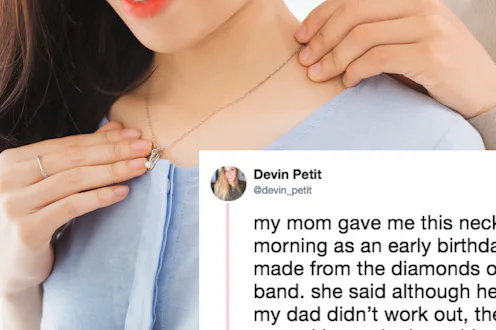 On Feb. 11, Pennsylvania resident Devin Petit tweeted a photo of the necklace her mother gifted her for her upcoming 21st birthday. Though it looked like just another lovely piece of diamond jewelry, there was more to it than met the eye. "My mom gave me this necklace this morning as an early birthday gift," Petit tweeted. "It’s made from the diamonds of her wedding band."