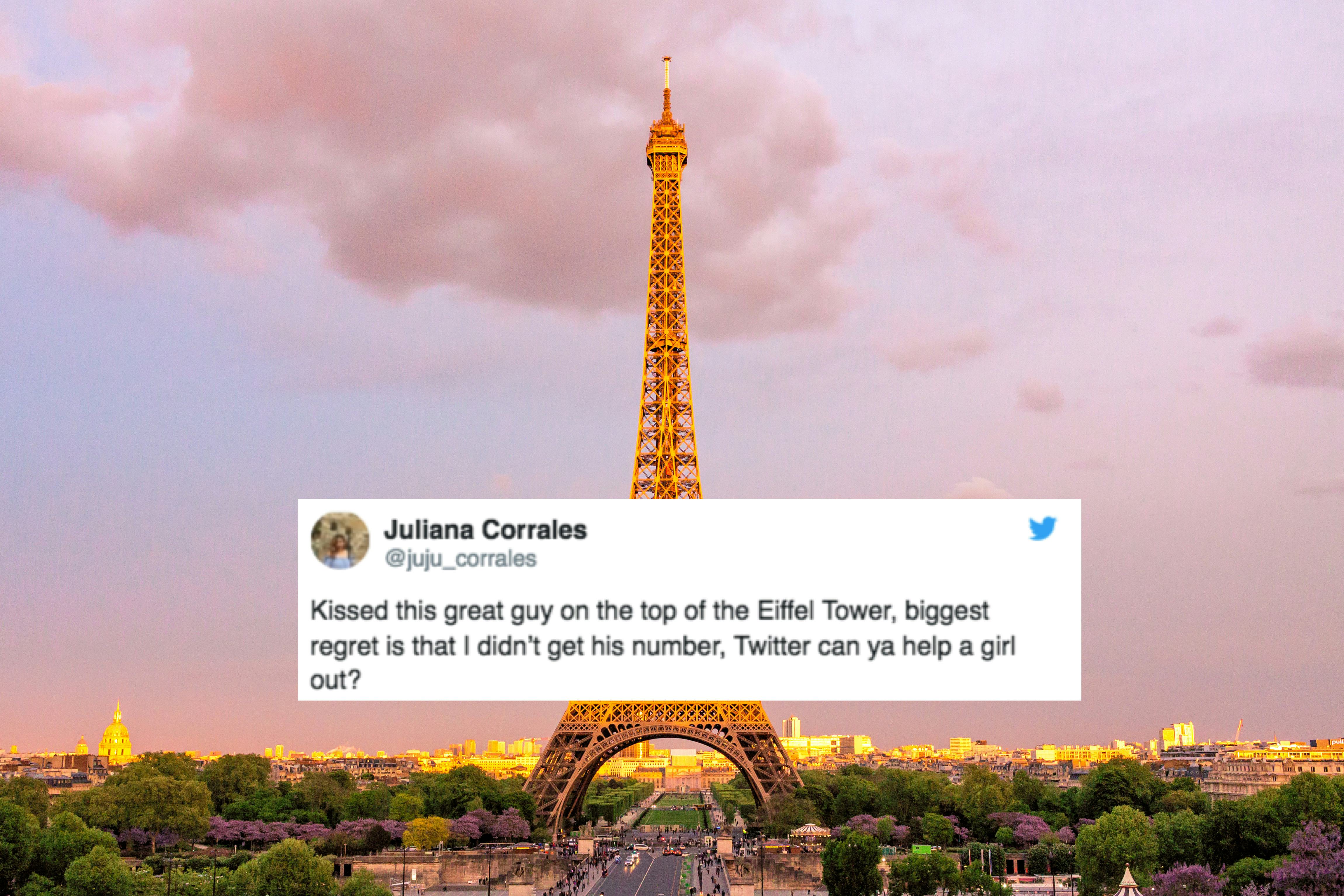 Paris is the city of love; and on a recent trip to France's capital, Juliana Corrales got to experience that firsthand. In a series of tweets, Corrales explained that she recently went on a 12-day trip to gorgeous Paris with her three besties, and while she was there, she made a promise to herself: she would kiss someone on the Eiffel Tower. On the last day of their trip, they stood at the top of the tower, searching for Prince Charming, but to no avail. Everyone seemed to be paired off. The clock was ticking. Suspense built. Would Juliana leave Paris kissless and disappointed?