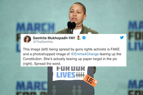 This image (left) being spread by guns rights activists is FAKE and a photoshopped image of @Emma4Change tearing up the Constitution. She's actually tearing up paper target in the pic (right). Spread the word.