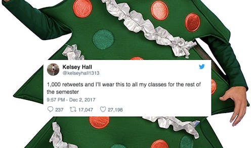 People are getting brave on Twitter — maybe a little too brave. First, there was the girl who promised to donate money to a children's hospital for every like and retweet she got... until the tweet went viral and added up to hundreds of thousands of dollars. Now, there's this girl in a Christmas tree costume who said if her photo got 1,000 retweets, she'd wear the costume to all of her classes for the rest of the semester. (Bustle has reached out for comment and will update upon response.)