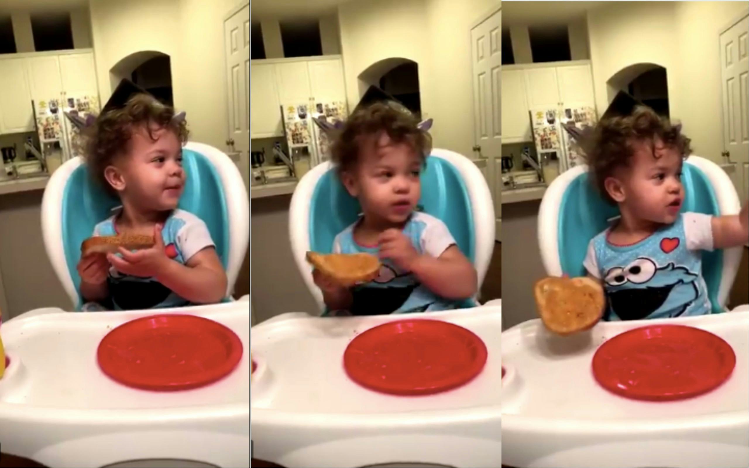 As reported by BuzzFeed, Alabama resident Ryan Dalton, 37, was hanging with his two-year-old daughter Maya recently in the home they share with Dalton's wife and Maya's mom, Raniece. Maya was eating an open-faced peanut butter sandwich, as one does, and since everything a toddler does is adorable — particularly, in fact, sandwich-eating — Dalton decided to film her. Everything was going hunky dory until something to Maya's right caught her eye. She suddenly stopped, her sweet little toddler smile fell, and she tried to scuttle to the side in her chair. "Spooky," Maya said, pointing to nothing. "That's spooky." OH MY GOD, WHAT.