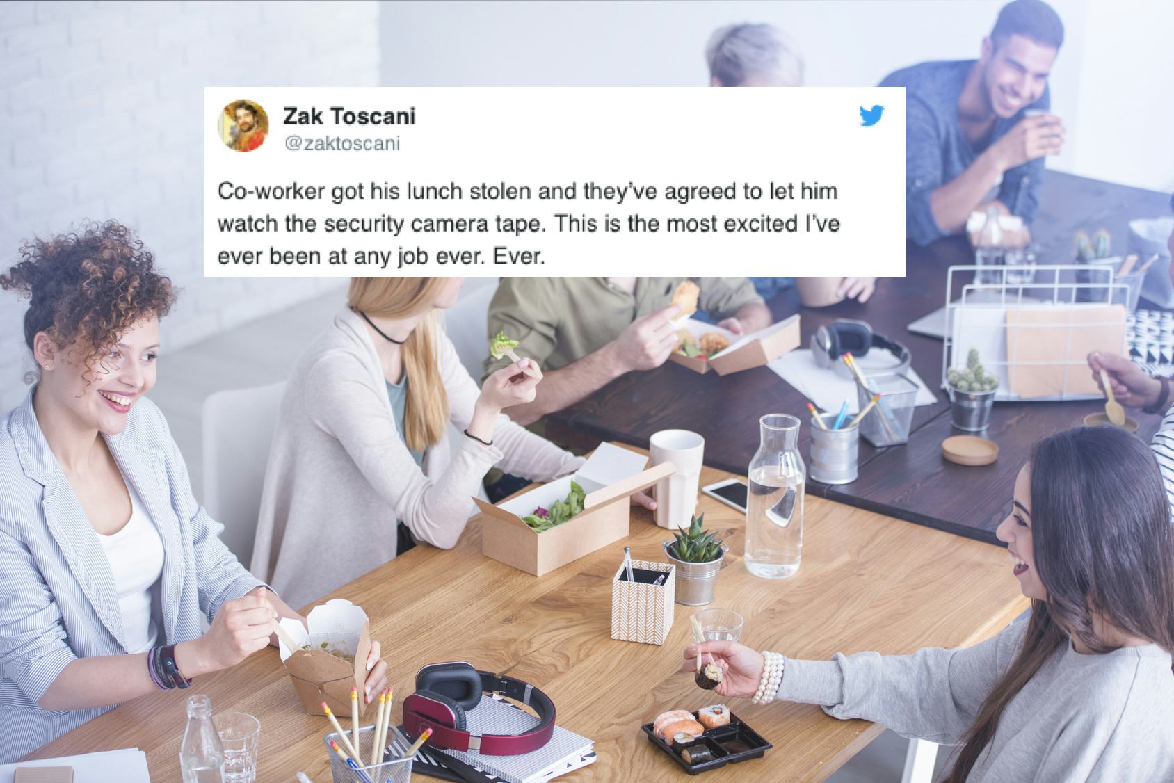 Remember that episode of Friends where Ross goes bananas after a co-worker steals his lunch? While this person's co-worker who had their lunch stolen didn't go all "red Ross," a viral Twitter thread about a stolen work lunch, where the victim was allowed to view security footage to catch the culprit, is going to have you on the edge of your seat. "Co-worker got his lunch stolen and they’ve agreed to let him watch the security camera tape," Zak Toscani tweeted. "This is the most excited I’ve ever been at any job ever. Ever." Hey, it's the little things that get us through the workday, like a Law & Order style investigation into the case of the missing lunch.