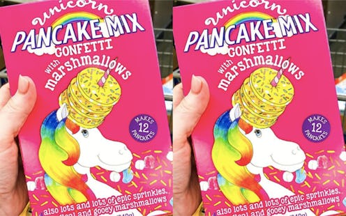 This delicious and slightly random treat comes from the home of delicious and slightly random treats, Aldi. It was spotted by Instagrammer @aisleofshame and looks just as over the top as you would want unicorn pancakes with marshmallows to be. The box promises “lots and lots of epic sprinkles, magical and gooey marshmallows" and it makes 12 full pancakes for just $2.99 a box. That's just about a quarter per pancake, if you're doing the math — which is, in the pancake world, quite the bargain.