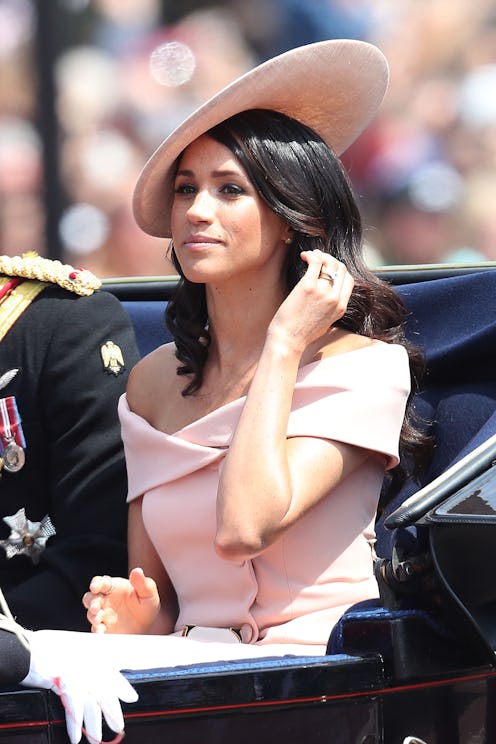 At the Trooping the Colour ceremony in the spring, which was her second official engagement, the Duchess stunned in a bespoke 'n' blush, Carolina Herrera ensemble. The off-the-shoulder shape went against the unwritten rule that royals cannot reveal their shoulders, as widely reported by The Sun. Her elegant Givenchy wedding gown had a similar construction. But she technically wore that infamous frock before she married into the family. So it wasn't a true break with protocol...