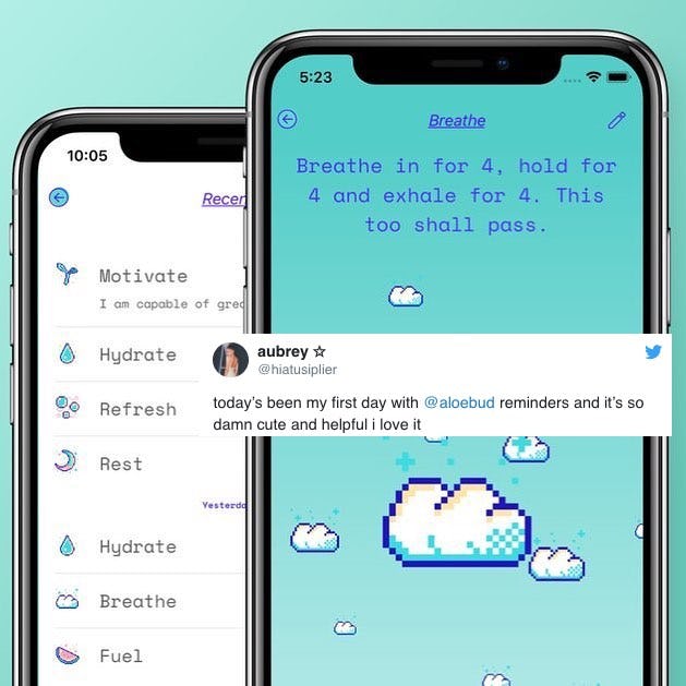 Aloe Bud launched in the App Store on April 25, and Discko says it currently has about 5,000 active users. As for whether or not there will be an Android version of Aloe Bud, Discko says they want the app to be available on every platform, but will have to see how things shake out when it comes to funding development. For those who have an iPhone or iPad, though, Aloe Bud is ready and waiting to offer compassionate self-care encouragement when you need it most.