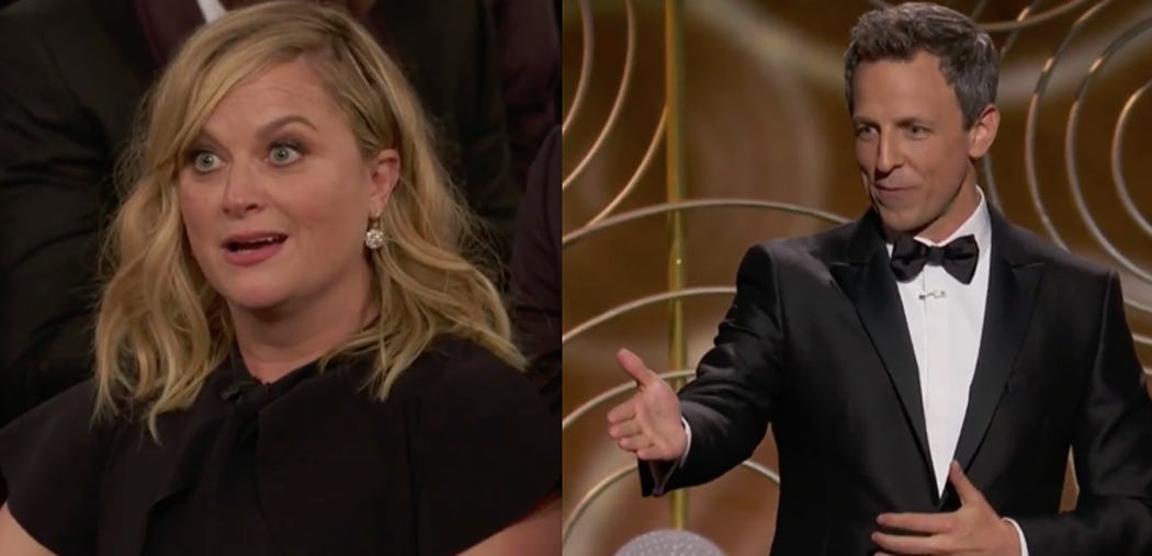 Following a caustic (and hilarious) opening monologue that took aim at Hollywood, Harvey Weinstein, and the White House, the former Weekend Update anchors paused for a brief reunion during a riff on Meyers' "Jokes Seth Can't Tell," which comes with a bit of an explainer. For those unfamiliar, the segment originated on Late Night as a space for Amber Ruffin and Jenny Hagel to tackle jokes outside of Meyers' white, male, cisgender point of view, and it felt appropriate that Meyers brought it to the Globes. Though a well-liked and accomplished comedian, he wasn't the ideal choice to tackle the industry-wide sexual misconduct allegations that have inundated Hollywood in recent months, nor the diversity issues that have been festering over the last few years. When Forbes ran an article in November declaring him the “feminist host” the Globes had needed, the internet seethed.
