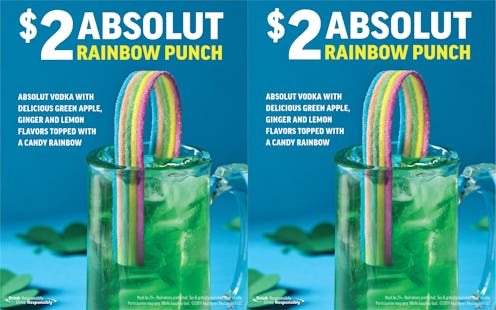 The drink, which will retail for $2 each, is "an authentic punch made with ABSOLUT vodka and the combination of green apple, ginger and lemon flavors, topped with a rainbow gummy garnish," per Applebee's. The chain did not specify whether you or no you're in danger of turning into a leprechaun like that one Disney Channel Original movie we're still not sure if we all collectively dreamed up, but I guess that kind of question is one only true Rainbow Punch pioneers can get to the bottom of this month. If they plan to, though, they'd better act fast — like most of Applebee's Neighborhood Drink of the Month deals, this one will only last until the end of the month it was introduced.