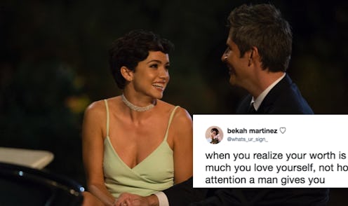 Perhaps the most telling clue, however, comes via a tweet from Jan. 10. "When you realize your worth is found in how much you love yourself, not how much attention a man gives you," she wrote alongside a screengrab of herself from the show. She later clarified that it "was not aimed at anyone or anything in particular," but the statement stands, and it sounds a lot like the revelations Corinne had after being sent home from Season 21.