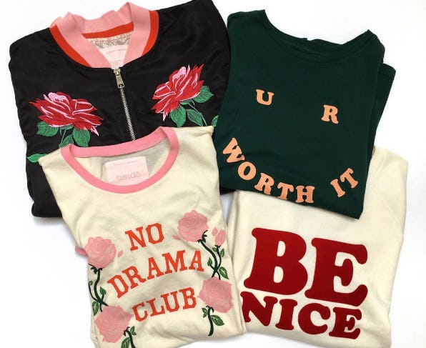 The collection includes tees that read, "no drama club" and "be nice" as well as a few embroidered items. Let's just say if you're looking for a way to wear your opinions on your sleeve, this is the collection for you.