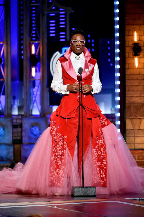 Billy Porter's fashion hot streak continues, and he effectively shuts down every red carpet at which he appears. Billy Porter's 2019 Tony Awards outfit was a dramatic and glamorous hybrid of a gown and a suit. It featured a white dress shirt and a red vest with pink satin lapels and buttons, along with red pants. It also featured a massive pink and red tulle train. The outfit was constructed from the same red curtain that fell for approximately 1,150 shows during Porter's Tony Award-winning run in Kinky Boots, according to The New York Times. It also included more than 30,000 Swarovski crystals, according to the press materials received by Bustle. While Porter's outfit was an unforgettable and ethically sourced from repurposed fabric, his accessories were just as wow-inducing. Case in point: Porter's reading glasses, which he wore multiple times throughout the night.