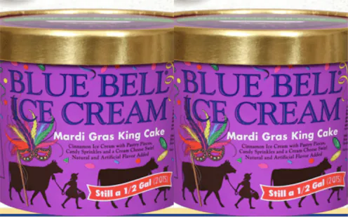 The festive ice cream is called Mardi Gras King Cake, and as explained on the Blue Bell website, it has cinnamon cake-flavored ice cream with pastry pieces, purple candy sprinkles, and a green cream cheese swirl, making it resemble a king cake.