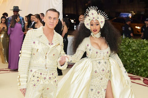 Jeremy Scott released a statement to E! News as soon as the pair hit the official 2018 Met Gala red carpet. According to the designer, the headpiece was made in three days — at first, Cardi didn't think she wanted a headpiece, and then changed her mind at her final fitting. Scott explained that the dress is adorned with pearls, rhinestones, glass beads, and jewels — and it took four weeks to create. Scott says he wanted to celebrate Cardi's pregnancy, and that "nothing is more divine than a pregnant woman."